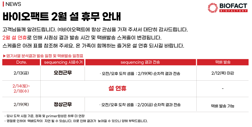 바이오팩트 2026년 2월 설 연휴 일정 안내