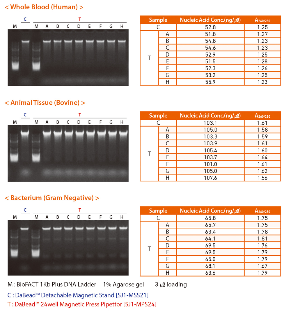- Genomic DNA 추출 효율 비교 – DaBead™ Detachable Magnetic Stand (C) VS DaBead™ 24well Press Pipettor (T)