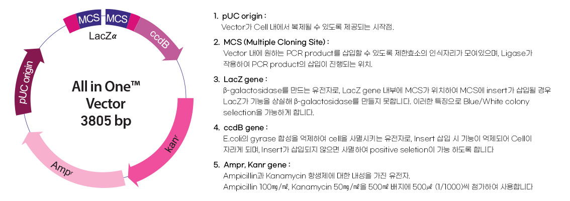 All in One™ PCR Cloning Kit는 PCR product의 cloning을 위한 제품으로서, All in One™ vector와 competent cell을 제공합니다. All in One™ vector는 Taq 뿐만 아니라 Pfu DNA polymerase에 의해 증폭된 모든 PCR 산물의 빠른 cloning에 적합한 제품으로서, Topoisomerase I 활성에 의해 상온에서 5분만에 Ligation이 가능합니다. BioFACT™ Competent cell은 DH5α 계열의 chemical competent cell로 heat-shock에 의한 transformation 방식에 적합한 제품입니다.
