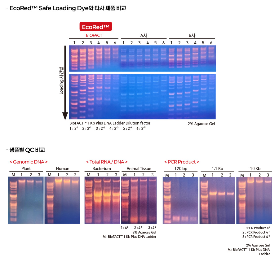 EcoRed™ Safe Loading Dye 제품은 fluorescent dye로써 안정적이고 민감한 핵산 염색 dye입니다. Agarose gel 전기 영동 시 toxic한 Ethidium Bromide (EtBr)를 대체하여 사용할 수 있는 제품으로 Non-mutagenic, Non-cytotoxic 하며 샘플과 함께 혼합하여 사용하여 별도의 염색과정이 필요하지 않습니다. EcoRed™ Safe Loading Dye 제품은 DNA/RNA와 강하게 결합하여 complex를 이루며, UV imaging을 통해 검출 가능합니다.