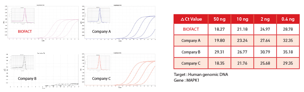 - Comparison of activity in various concentrations of template between BioFACT™ 2X Real-Time PCR Master Mix