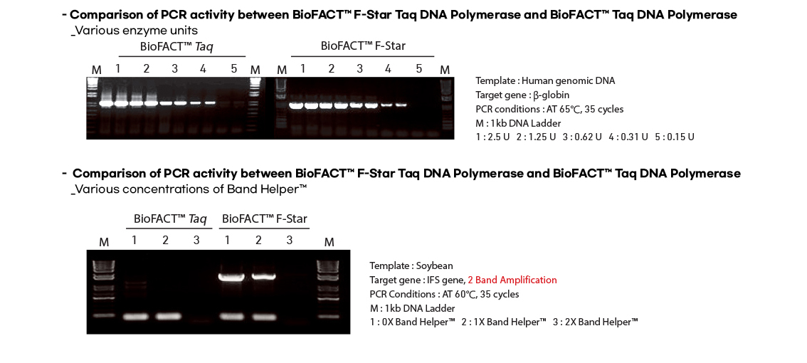 BioFACT™ F-Star Taq DNA Polymerase is designed to be highly specific to the target gene through chemical-mediated Hot Start system. It has similar features with BioFACT™ H-Star Taq DNA Polymerase and especially it is suitable to amplify DNA fragments larger than 1kb. In case of chemical-mediated Hot Start PCR enzymes, its amplification efficiency and productivity may be lower than general Taq DNA Polymerase. In this case, it can be supplemented by increasing the cycle.