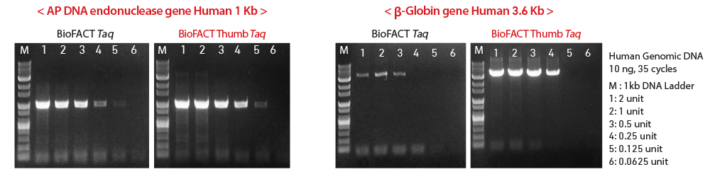 - Comparison of enzyme activity by various enzyme units between BioFACT™ Taq and BioFACT™ Thumb Taq