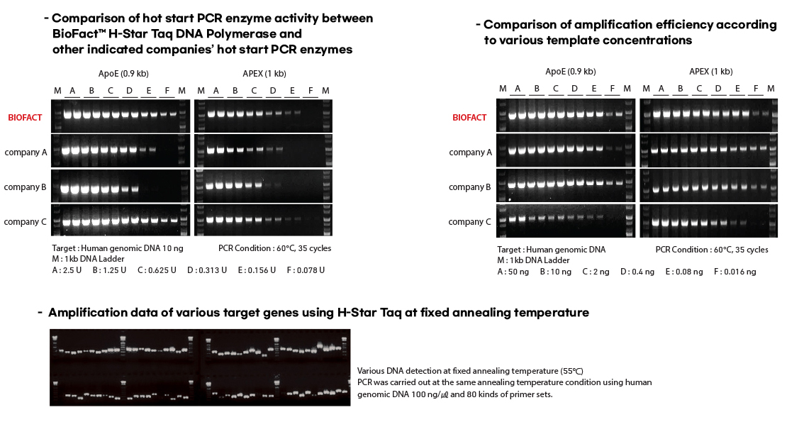 BioFACT™ H-Star Taq DNA Polymerase is a chemical-mediated Hot Start Taq DNA polymerase which leads to complete inactivation of the polymerase until the initial heat activation step. Through this feature, it provides high PCR specificity, avoiding extension of non specific annealed primers or primer-dimers and it is highly suitable for efficient amplification of difficult templates caused by high GC content or complex structure. BioFACT™ H-Star Taq DNA Polymerase is optimized to amplify less than 1 kb size target DNA and it can be supplemented by increasing the cycle as amplification efficiency and productivity of chemical-mediated Hot Start PCR enzymes may be lower than general Taq DNA Polymerase.