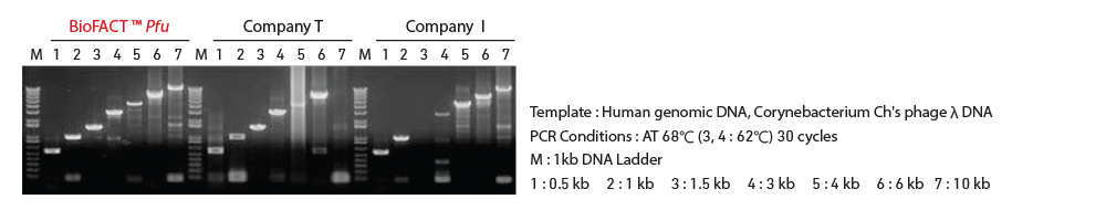 - Comparison of amplification efficiency according to various sizes of template between BioFACT™ A-Star LampTaq DNA Polymerase and other companys’ Pfu DNA Polymerases