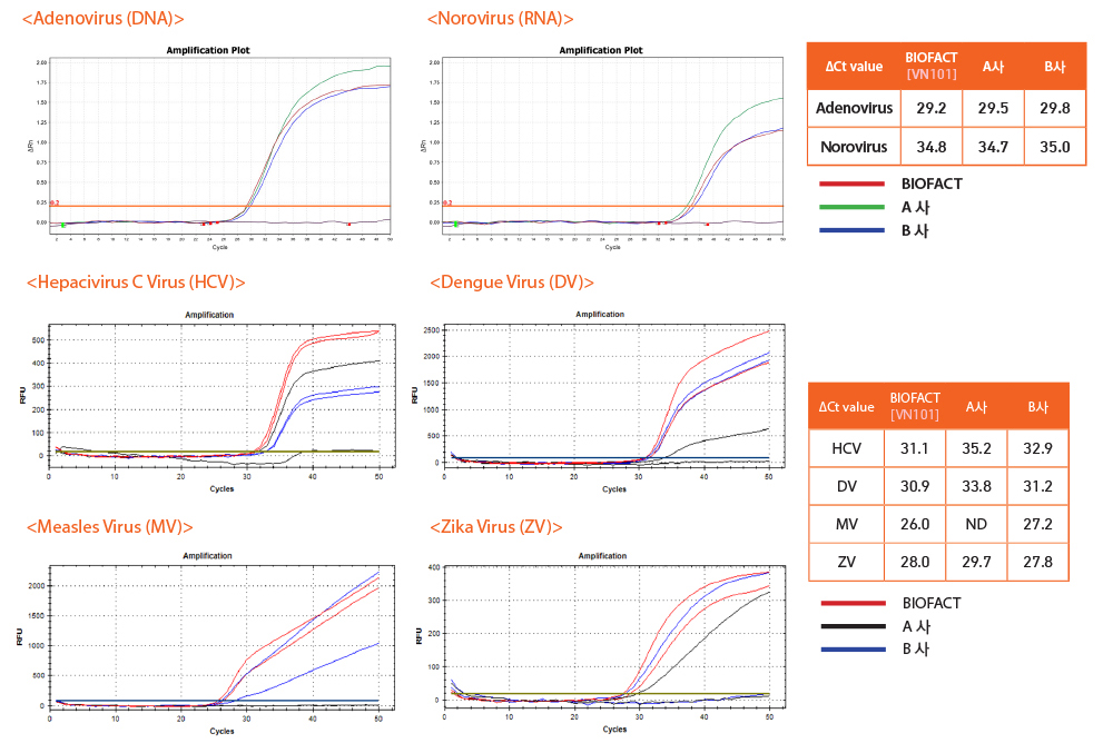 - Comparison of amplification efficiency for extracted viral RNA/DNA using DaBead™ Viral RNA/DNA Prep Kit and the other