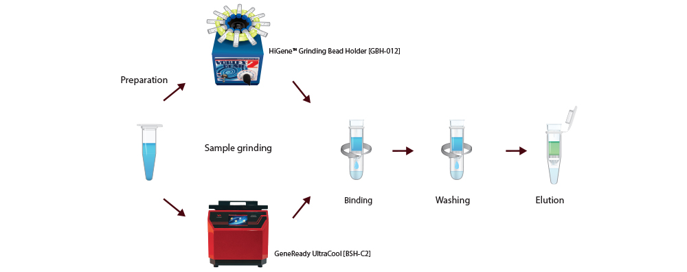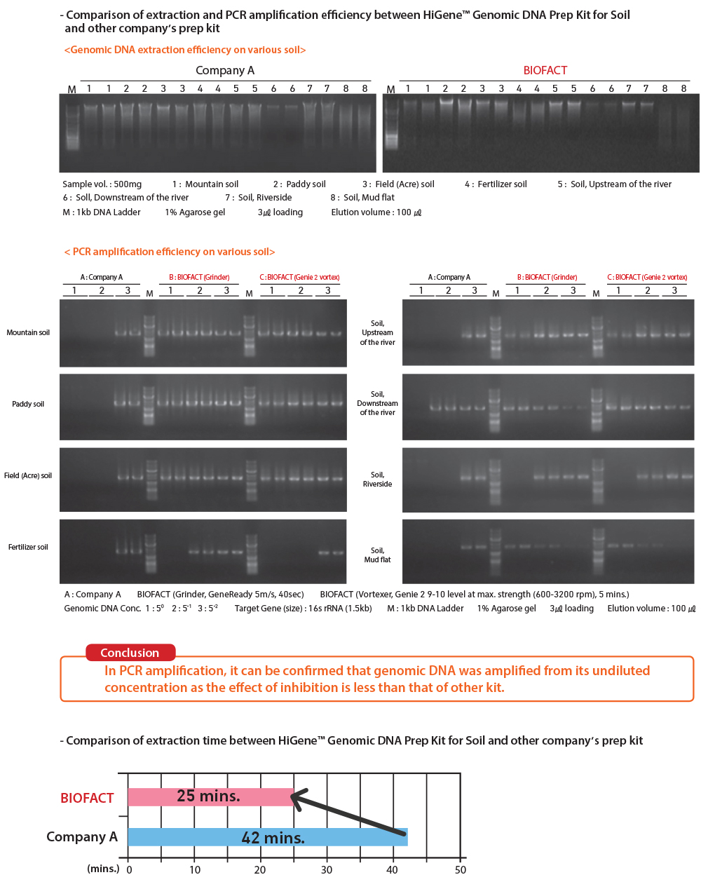 HiGene™ Genomic DNA Prep Kit for Soil is a column & grinding bead type kit that can extract high-quality genomic DNA from soil. The kit includes a BioFACT™ grinding bead tube for efficient dissolution. Additional enzymes such as high-concentration lyticase or lysozyme are unnecessary except proteinase K and genomic DNA can be extracted easily and quickly using a general vortex mixer. Extraction process is also more convenient compared to products from other manufacturers. In addition, less PCR inhibitor is extracted compared to the products from other manufacturers, so PCR amplification can be done from undiluted genomic DNA.