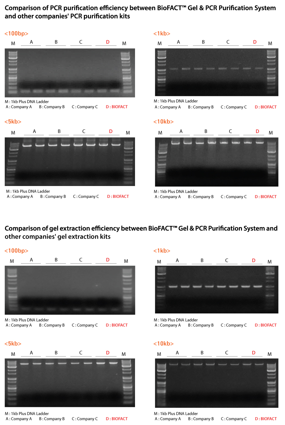 BioFACT™ Gel & PCR Purification System is a spin column typed kit which has dual functions of gel extraction and PCR Purification. It provides the high purification system of high yield DNA from 100 bp to 14 kb, and it has an advantage of selective purification system of the two conditions (high yield and primer-dimer removal) according to the application needs. BioFACT™ Gel & PCR Purification System is suitable to obtain high quality DNA fragments through high salt buffer and glass microfiber membrane. Furthermore, it is available to verify whether Help B has been properly used in process of PCR purification with naked eye as pH Indicator in UB buffer turns purple by use of Help B.