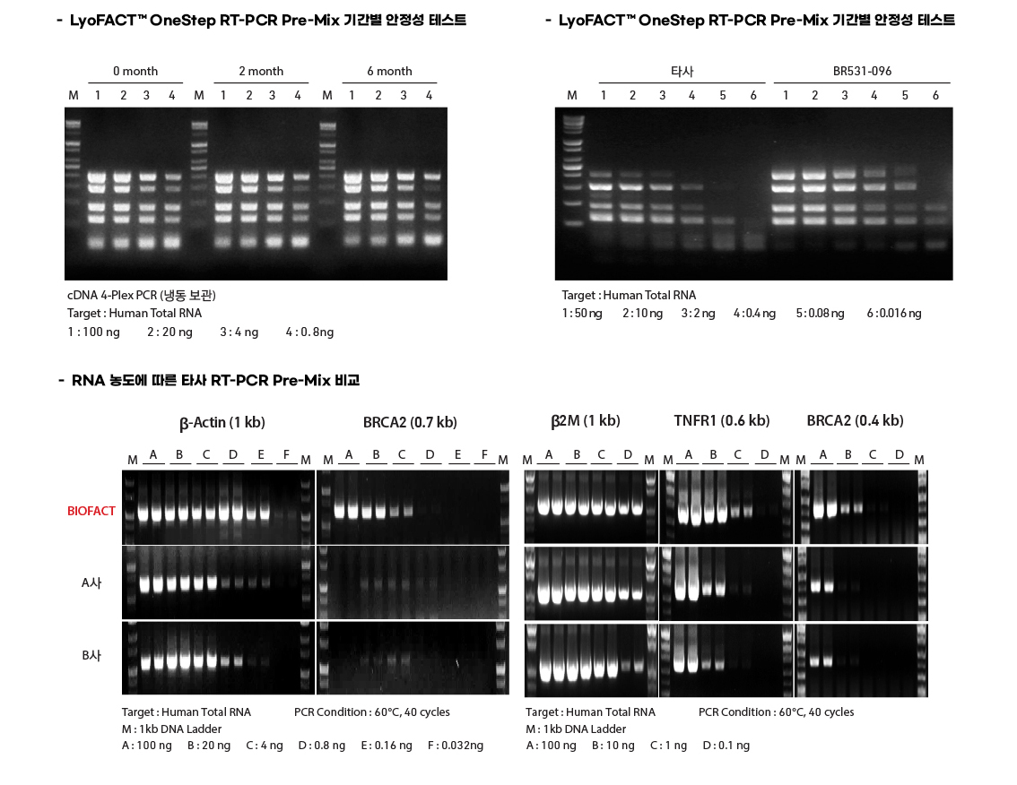 LyoFACT™ OneStep RT-PCR Pre-Mix는 cDNA 합성과 PCR 증폭을 OneStep으로 간단하고 편리하게 실험할 수 있습니다. BioFACT™ RTase와 H-Star Taq DNA polymerase를 최적의 조건으로 혼합한 제품입니다. BioFACT™ RTase(M-MLV)는 최적의 활성 온도가 50℃인 특징을 가지며, H-Star Taq DNA polymerase는 chemical-modified hot start activity를 가짐으로써 target gene에 대한 매우 높은 특이성을 가지며, PCR product size 1kb 이하를 증폭할 경우에 적용할 수 있습니다. 사용하기 쉽도록 동결건조 방식을 적용하여 보관 안정성을 높이고, 일반 solution(Pre-Mix) type 보다 template 사용량을 증가 시킬 수 있어 검출 강도를 높일 수 있습니다.