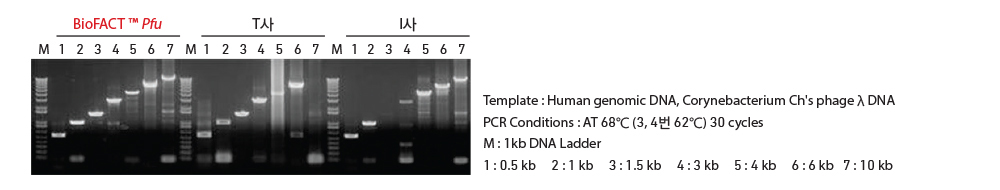 - 다양한 크기의 Target Gene 증폭에 따른 Fidelity 기능이 있는 타사 DNA Polymerase와 비교